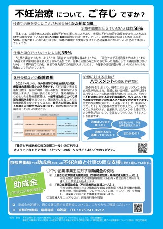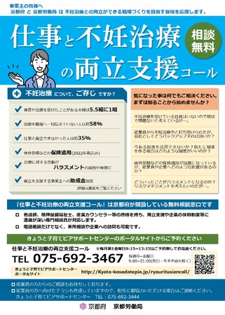 京都府では、子育てしやすいまちの実現を目指して、子どもをもちたいと希望しながら子どもに恵まれず、不妊治療を受けておられる方を支援するため、不妊治療を受けながらでも安心して働き続けられる環境づくりに取り組んでいます。平成30 年10 月より「仕事と不妊治療の両立支援コール」を開設し、仕事と不妊治療の両立に関するご相談に対応しているところです。この度、仕事終わりや土日においてもご相談いただけるよう予約制相談の対応時間を拡大し、4 月1 日から24 時間・365 日相談が可能となりますので、是非ご利用ください。