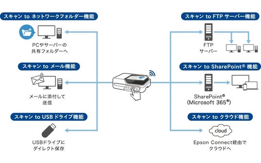 『DS-1760WN』はネットワークに標準対応し、複数のPCでスキャナーを共有利用したり、スマートデバイスから直接スキャンしたりできます。また、ネットワークを介して本体のタッチパネルから指定した宛先にダイレクトにデータ送信・保存できるPCレス機能も搭載。スキャナー本体だけで誰でも簡単に電子化できるため、職場内のスムーズなデータ共有や活用の幅を広げます。