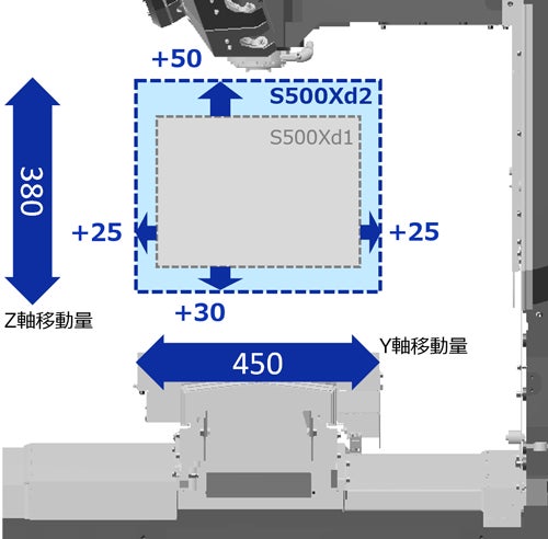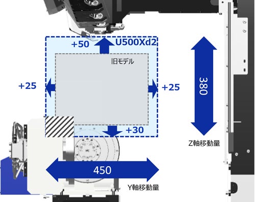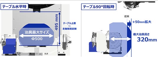 Y軸およびZ軸移動量拡大により加工可能領域が拡大した。大型ワークの多面加工や、搭載可能な治具が増えることなどにより、工程集約への対応能力を向上させた。