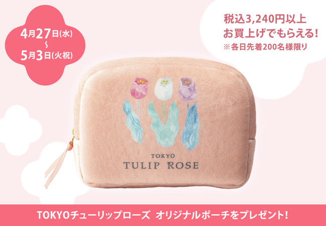 さらに今回のポップアップストアでは、税込3,240円以上お買上げのお客様(各日先着200名様)に可愛いオリジナルポーチをプレゼント!このゴールデンウイークは「TOKYOチューリップローズ」の可愛すぎるスイーツたちにかこまれて、素敵なスイーツタイムをお楽しみください。