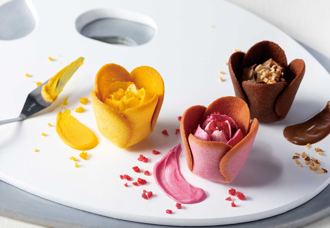 繊細なラングドシャクッキー細工のチューリップの中に、とろけるショコラクリームのローズを咲かせた、金井理仁の代表作です。甘酸っぱい「ベリー」、深みある「キャラメルナッツ」、爽やかな「パッションマンゴー」の3種類。