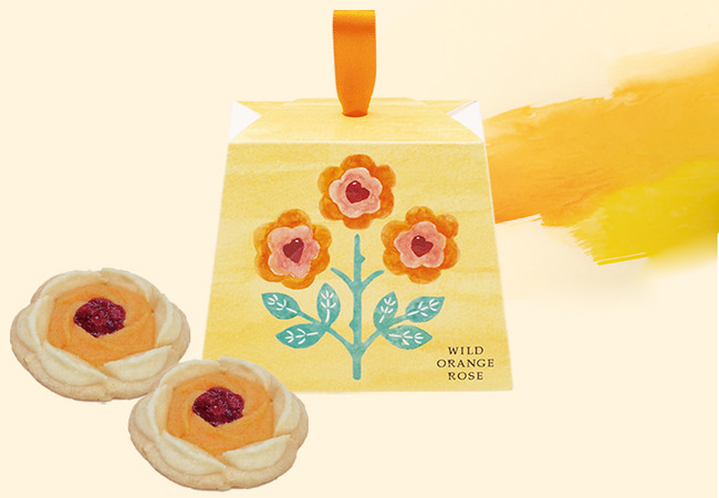 パリの森の野ばらがテーマの可憐なクッキー。オレンジ色の花びらは、ジューシーなバレンシアオレンジ果汁香るクッキー。クリームイエローの花びらは、芳醇国産バター香るバタークッキー。トップには甘酸っぱいラズベリー・コンフィチュールの朝露をのせて、さっくりと焼き上げました。