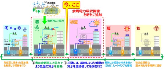 今回の共同開発では、帯水層蓄熱システムに対し、世界で初めて余剰再エネ電力吸収システムを採用。余剰再エネ電力吸収システムは、冷熱の蓄積と放出を柔軟に繰り返す短周期蓄放熱と、季節間蓄熱によって地中に蓄えられた冷水塊の中に、さらに低温の冷水を蓄える多重蓄熱機能を備えています。