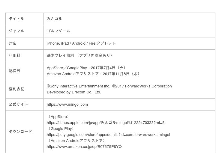 『みんゴル』は、「プレイステーション」を代表する作品のひとつ「みんなのGOLF」シリーズの“誰でも簡単にゴルフゲームを楽しめる”というコンセプトを、スマートフォンの特性や、プレイスタイルに合わせて最適化し、誰もが、いつでもどこでも、爽快ショットで手軽にゴルフゲームをお楽しみいただけます。