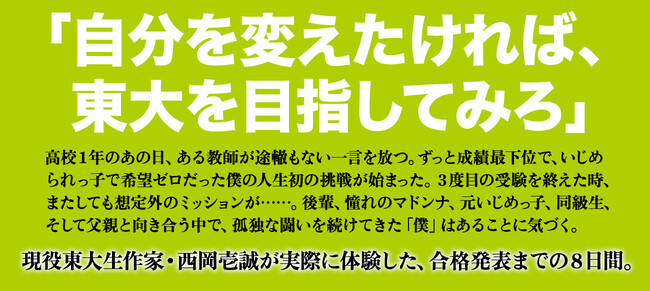 高校1年のあの日、ずっと落ちこぼれだった僕は、ある教師の一言で途轍もない挑戦を強いられた。「自分を変えたければ、東大を目指してみろ」。結局2浪、3度目の受験を終えた時、その教師がまた想定外のことを言い出して……。後輩、憧れのマドンナ、元いじめっ子、同級生、恩人、そして父親と向き合う中で、孤独な闘いを続けてきた主人公の「僕」はあることに気づく。現役東大生作家・西岡壱誠が実際に体験した、合格発表までの8日間。