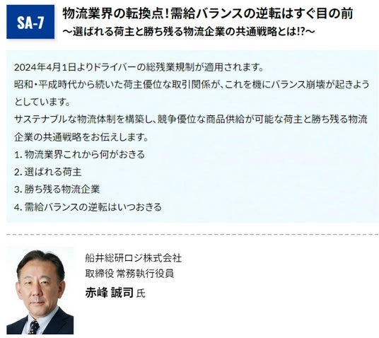 日本最大級のロジスティクス・物流コンサルティングファーム 船井総研ロジ株式会社(東京本社:東京都千代田区、代表:菅重宏、以下「船井総研ロジ」)取締役 常務執行役員の赤峰誠司は、2024年4月10日(水)~12日(金)の計3日間、インテックス大阪にて開催する「第5回 関西物流展 KANSAI LOGIX 2024」の特別セミナーにて、「物流業界の転換点!需給バランスの逆転はすぐ目の前」をテーマに講演いたします。なお、赤峰の講演は展示会2日目の2024年4月11日(木)14:00-15:00を予定しています。