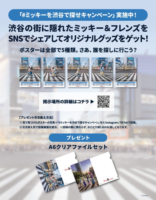 ポスターの写真+「#ミッキーを渋谷で探せキャンペーン」をX/Instagram/TikTokにて投稿いただくと、「ミッキー&フレンズ In Real Life」 A6クリアファイルセット(非売品)をプレゼントします。
