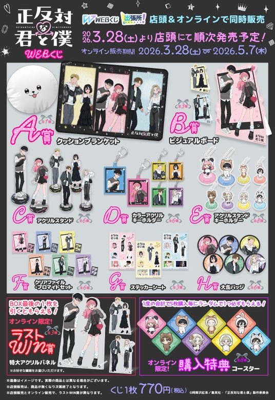 TVアニメ『正反対な君と僕』より、描き下ろしイラストを使用した限定グッズが当たるTVアニメ『正反対な君と僕』 WEBくじが登場!「WEBくじ出張所」として全国の販売店舗と、オンラインくじサイト「WEBくじ」にて販売中となっております。