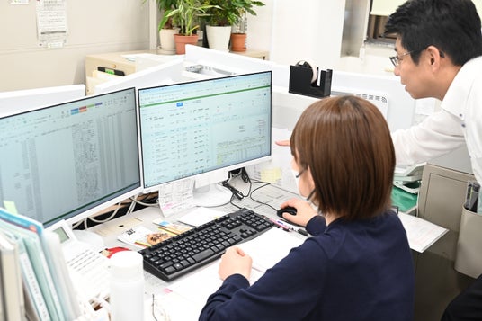 法人本部事務局の財務担当者がオンラインで請求書を確認する様子