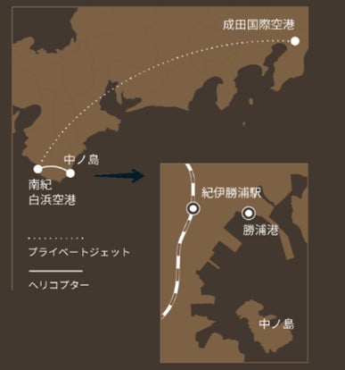 この特別なツアーでは、JALビジネスアビエーション株式会社の手配協力のもと、成田国際空港から南紀白浜空港までの移動をプライベートジェットで、さらに南紀白浜空港からは貸切のヘリコプターで勝浦港に浮かぶ「中ノ島」ヘリポートへとご案内いたします。ご宿泊いただくのは、聖地熊野をコンセプトにした隠れ家リゾート「碧き島の宿 熊野別邸 中の島」です。古から伝わる熊野信仰を舞台に、熊野の麓にある一島一旅館の全国でも珍しい「紀の松島に浮かぶ天然温泉宿」です。このホテルのある島を完全に貸し切り、他では味わえない優雅でプライベートな空間をお楽しみいただけます。