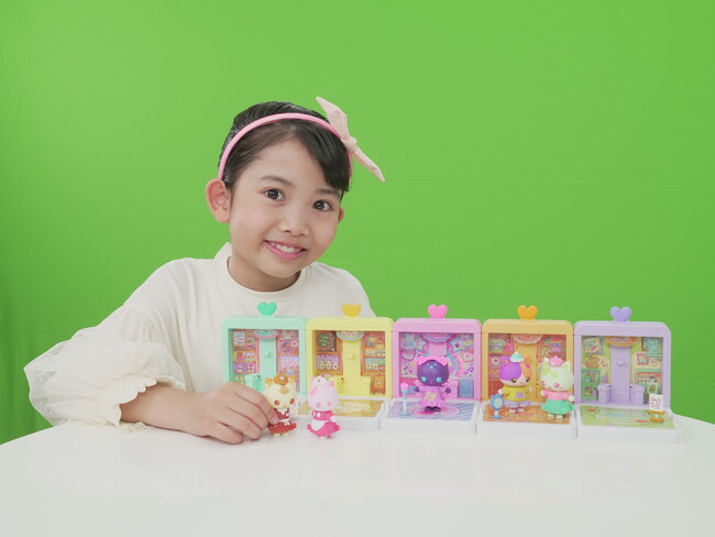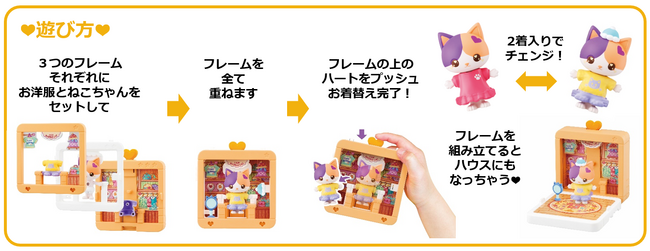 『スナップフレンズ』は、「着せ替え遊び」と「ドールハウス遊び」が楽しめるねこのドールシリーズです。「着せ替え遊び」は、服とドールをセットしたフレームを3枚重ねてフレーム上にあるハートをプッシュすることでドールが服を着て、ポンとフレームから外れます。ドールに、ヘッドホンなどのアクセサリーをつけてお着替え完了です。1商品に2つの服が入っています。「ドールハウス遊び」は、お着替えに使ったフレーム本体を組み立ててドールとマイクなどの小物をおいてハウスを完成させ、お人形遊びができます。ハウスは連結可能で、集めればタウンが広がります。これまでにない不思議なギミックでのお着替えとおなじみのドールハウス遊び両方が楽しめます。