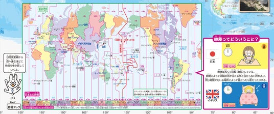 ◆ 丸い地球を平面の地図に表す工夫や時差のしくみがわかる詳しい解説を掲載