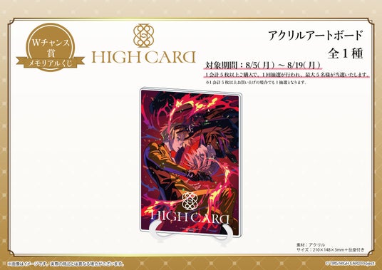 アクリルアートボードは、TVアニメ『HIGH CARD』の「eeoくじ」を1会計5枚以上お買い上げで1回抽選を行い、最大5名様にプレゼントします。