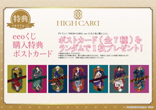 今回発売したTVアニメ『HIGH CARD』の「eeoくじ」を1会計で5枚ご購入ごとに、ポストカード(全7種)をランダムで1枚プレゼント。