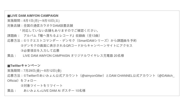 通信カラオケDAMでは『瞳へ落ちるよレコード』収録曲の全13曲が歌えるほか、本人映像やオリジナルコメントを配信します。併せて、オリジナルグッズが当たる歌唱キャンペーン「LIVE DAM AiMYON CAMPAIGN」を8月1日より実施します。
