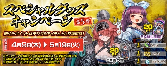 あわせて、本キャンペーンでは、各店舗で集めたポイントをデジタルアイテムに交換することができ、武将カード「EX香の前」「EX顔世御前」をはじめ、ゲーム内で使用できる各種アイテムが入手可能です。