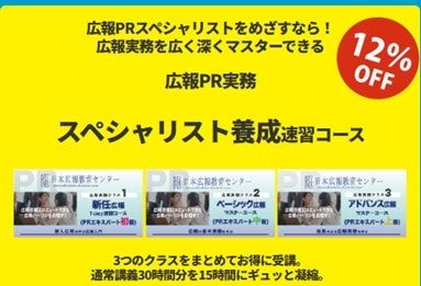 ●「広報PRスペシャリスト養成(速習)コース」とは、日本広報教育センターの主力講座である「新任広報育成/速習コース」と「ベーシック広報実務マスター/速習コース」、「アドバンス広報実務スキルコース」の3つの講座を組み合わせた特別なコースです。