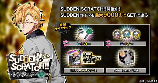 イベント期間中、KILLER SCRATCH!!をプレイするとライズ消費量に応じた確率でSUDDEN SCRATCH!!が発生します。SUDDEN SCRATCH!!をプレイすると、通常の報酬アイテムの他、限定アイテム「SUDDENコイン」を獲得することができます。「SUDDENコイン」を集めることで、レイズキーやシンジュク・ディビジョンのデコステッカーに使えるブースターなどと交換することが可能です。他にも、ストーリーカードの【Live it up】シリーズ、「A.R.B remix」楽曲などがラインナップされています。詳細はアプリ内お知らせをご確認ください。