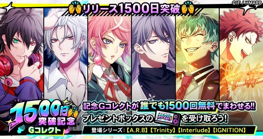 本作『ヒプノシスマイク -Alternative Rap Battle-』がリリースから1500日を突破していることを記念し、どなたでも無料で〈1500回〉Gコレクトを回せるキャンペーンを実施しています。期間中のログインで専用アイテム「1500日突破記念Gコレチケット:10回」を150枚プレゼント中です。詳細はアプリ内お知らせをご確認ください。