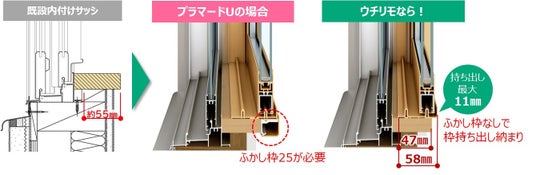 そこで「ウチリモ 内窓」はガラス総厚18mmの複層ガラスを搭載しながら、下枠の見込み寸法を薄くし58mmを実現。さらに窓額縁から最大11mm室内側に枠を持ち出すことによって窓額縁の取り付け寸法が最小47mmあれば設置が可能になりました。今まで内窓設置の際にふかし枠が必要だった築年数が古い木造住宅でも、ふかし枠無しで約75%の窓に設置できるようになります。