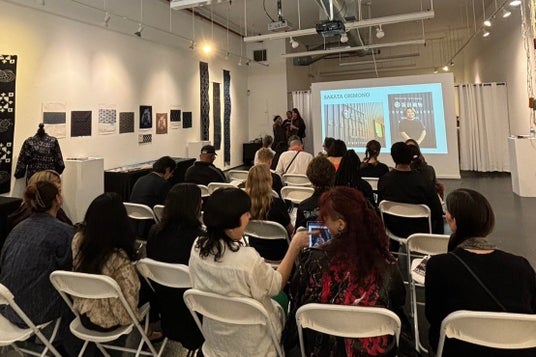 9月26日、ニューヨークにて開催されたテキスタイルの国際的な展示会「New York Textile Month※1」にて、国際ファッション専門職大学の学生が参加し、日本の伝統綿織物「久留米絣(くるめかすり)」の織元である坂田織物との展示発表※2を行いました。本学では、日本各地の繊維素材や染織技術の魅力を見出し、産地と連携しながら海外へ新しいファッション知財として発信することを目的としたカリキュラムに取り組んでおり、学生たちは久留米絣のパイオニアである坂田織物(福岡県八女郡)にて実習を行ってきました。