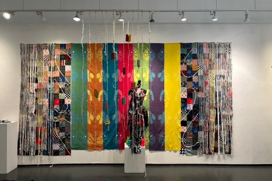 「私はNYの現地に伺い、作品の設営や英語でのプレゼンテーション、パーソンズ美術大学で行われた特別授業に参加しました。クリエイティブでは、今回のために坂田織物様が一から制作をしてくださった久留米絣のグラフィックデザイン、そして久留米絣のハギレや括り糸をアップサイクルしたドレス、装飾を担当し、福岡県久留米市の工房にお伺いし実際に目で見てハギレや資材を選ぶという大変貴重な経験をさせていただきました。今回坂田織物様の取り組みに参加させていただいた中で“本物の価値とは”を改めて考えることができ、また更に久留米絣を好きになりました。今後も伝統文化×ARTで世界に発信をしていきたいと思います」