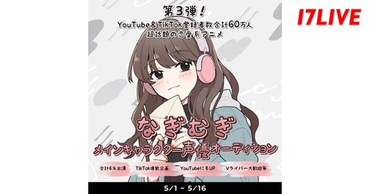 17LIVE株式会社(東京都渋谷区、代表取締役:ジャン・ホンフイ、URL:https://jp.17.live/)が運営する日本最大級のライブ配信アプリ「17LIVE(イチナナ)」は、YouTube・TikTokを中心に登録者数合計60万人を有する恋愛漫画「なぎむぎ」とコラボレーションのもと、メインキャラクターを含めた声優として出演するライバーを選出するイベント、「『なぎむぎ』メインキャラクター声優オーディション」を、本日2025年5月1日(木)より開催することが決定しましたので、お知らせいたします。