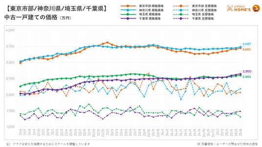 中古一戸建ての平均掲載価格は、首都圏(東京都、神奈川県、埼玉県、千葉県)が3,726万円(前年同月比104.5%)で2023年12月以来18ヶ月ぶりに3,700万円台まで回復しました。
