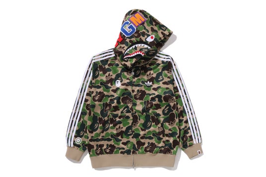 フットウェアは、 ADISTAR HRMY、SAMBA、CAMPUS 00’Sという 3 種類をラインアップ。ADISTAR HRMY は、リフレクター仕様の BAPE STA(TM) アンダーレイの上にトレフォイルを加えた ABC CAMO の特色溢れるグリーン アッパーを重ね、シャークモチーフの プリントでミッドソールを支える構造。