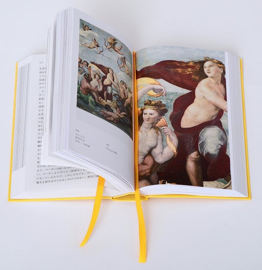 - テキストと図版とを交互に見ながら読み進めることができるように、しおり紐を特別に2本セット。しおり紐は表紙のクロスと同色の鮮やかな黄色です。テキストページ内に記される図版ナンバーで図版にあたることができますので、1本はテキストページに、1本は図版ページに使用することで、容易に双方を行き来することができます。