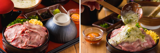 肉まぶし追加メニュー「特製出汁とろろ」も味変におすすめです。王道の「牛タン×とろろ」はもちろん、「和牛赤身×とろろ」も両者の旨味を引き出しあい深い味わいをお楽しみいただけます。