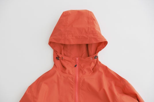 また、大人用は襟ぐり部分に縫い付け、キッズ用は単体で平ゴムが付いており、小さく畳めるポケッタブル仕様なので、気温差のある日や急な雨などに備えて持ち運びが可能です。大人用の裾とフードにはドローコードが、袖口には面ファスナーがついており調節も可能です。安全面を考慮し、キッズサイズのフードは着脱式になっているほか、袖口の面ファスナーやフードのドローコードは付けておりません。