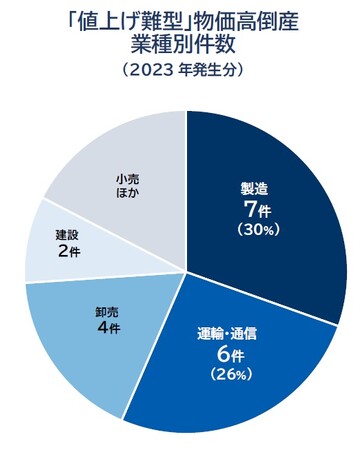 2023年に発生した、燃料や原材料などの「仕入価格上昇」により収益が維持できず倒産した「物価倒産」は、7月までに累計442件発生した。このうち、価格転嫁を取引先から拒絶されたり、僅かな値上げしか認めてもらえず、結果的に経営破綻を余儀なくされた「値上げ難型」の物価高倒産は少なくとも23件判明した。23年に発生した「物価高倒産」全体の約5%を占め、前年同期の12件に比べて倍増ペースで推移している。業種では『製造業』や『運輸・通信業』で多かった。