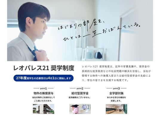 株式会社レオパレス21(東京都中野区 代表取締役社長:宮尾 文也、以下「当社」)は、26年度に続き、27年度奨学生の募集を実施することを決定いたしました。なお、本日奨学制度特設ページにて27年度奨学制度の募集要項を公開しましたので、お知らせいたします。