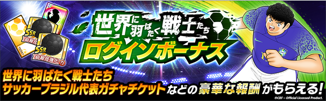 「世界に羽ばたく戦士たち ログインボーナス」では、期間中最大5枚の「世界に羽ばたく戦士たち サッカーブラジル代表ガチャチケット」などを獲得できます。ぜひログインしてお楽しみください。