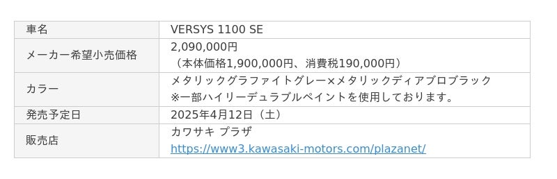 株式会社カワサキモータースジャパン(本社:兵庫県明石市、代表取締役社長:佐伯 健児)は、専用カラーと特別な装備を備えたスペシャルエディションモデル「VERSYS 1100 SE」を2025年4月12日(土)に新発売いたします。