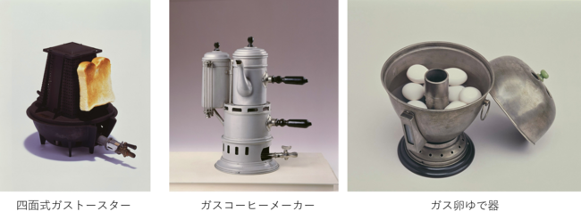 日本人の食生活に不可欠な炊飯を進化させた国産ガス機器特許取得第一号の「ガスかまど」をはじめ、昭和モダンを醸し出す昭和初期の逸品「四面式ガストースター」や「ガスコーヒーメーカー」、「ガス卵ゆで器」などの調理器具の実物を展示しています。