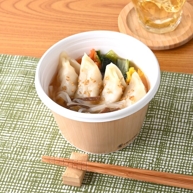 【内容】つるもち食感の水餃子と、春雨、もやし、人参、チンゲン菜、きくらげ、玉子を盛りつけた食べ応えのある中華スープです。「丸鶏だし」をベースに醤油やごま油の香りを効かせ、もろみでコクと深みを出した、シンプルながらも旨みのあるスープに仕上げました。