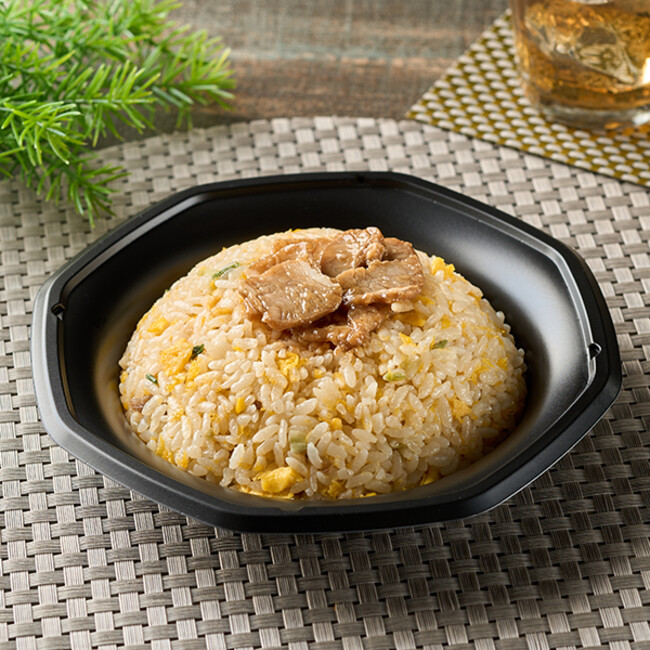【内容】高温で炒め、香ばしく仕上げた炒飯です。玉子、ねぎ、チャーシュー、ご飯を炒め、塩ベースの「丸鶏だし」の旨味が特徴の中華湯で味付し、こいくちしょうゆとねぎ油で仕上げました。直火焼したチャーシューをたれで和え、トッピングしました。