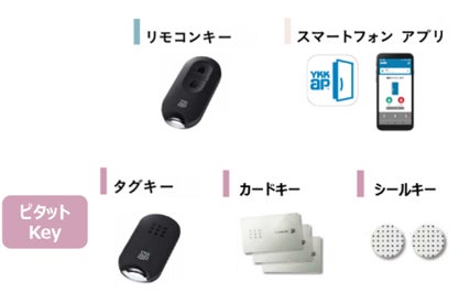 門扉から離れていても施解錠が可能で、カギをポケットに入れたまま門扉設置のボタンを押すだけで施解錠が可能な「リモコンキー」、専用アプリで施解錠する「スマートフォンアプリ」、カギをリーダーに近づけるだけで開け閉めできるピタットKey「タグキー/カードキー/シールキー」(※4)の5種類のカギをラインアップしています。