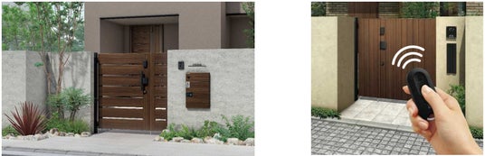 (左)「電気錠付門扉 ルシアス 門扉」YS4型、(右)リモコンキー操作による門扉の施解錠が可能