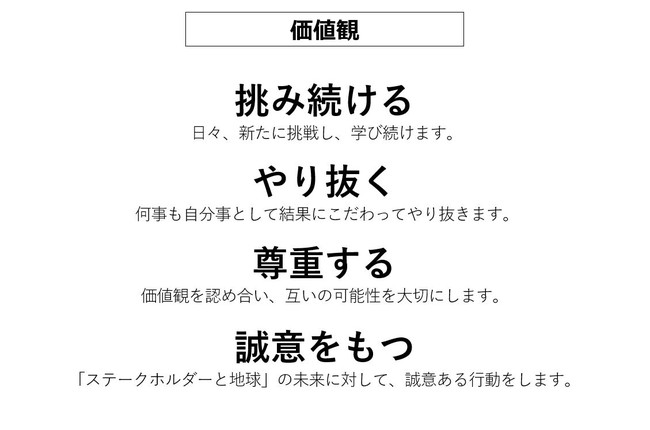 新しいグループ経営理念は、お客さまや社会にとって“自分たちは何者か・何のために存在しているのか”を示した「存在意義」と、東京ガスグループ従業員が“何を大切にして行動するのか”を示した「価値観」で構成しています。