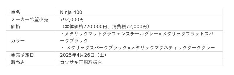 株式会社カワサキモータースジャパン(本社:兵庫県明石市、代表取締役社長:佐伯 健児)は、「Ninja 400」のカラー&グラフィックモデルを変更し、2025年4月26日(土)に発売いたします。