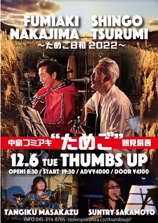 俳優・鶴見辰吾と歌手で作詞家・作曲家の中島フミアキとのデュエット「ためご日和」のライブが12月6日(火)に横浜のダイニングバーTHUMBS UPにて行われる。https://bit.ly/3tA4CRC