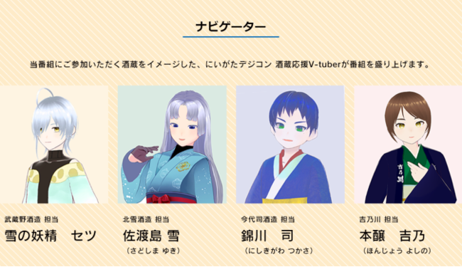新潟県の酒蔵を盛り上げるため、MCとVTuberが新潟清酒の魅力を楽しく紹介する番組を2月11日(金・祝)19:00-20:30よりYouTube Liveで配信します。 番組では県内4か所、それぞれの酒蔵をイメージしたVTuberが紹介する酒蔵見学ツアーも予定されています。