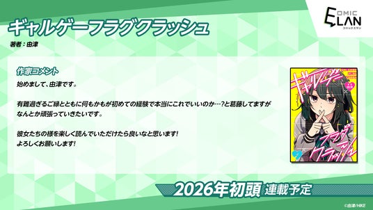 株式会社HIKE(本社:東京都新宿区、代表:三上 政高、以下「HIKE」)の電子漫画出版事業を担う「HIKE編集部」は、少年/青年向け作品を中心に扱うレーベル「COMIC ELAN」(コミックエラン)の第一弾として、『ギャルゲーフラグクラッシュ』を連載開始予定です。本作品はギャルゲーの世界に閉じ込められた限界オタクOLが、現実世界へ戻るために奮闘するイチャラブコメディです。正式な配信開始日、配信プラットフォームは後日発表をお待ちください。
