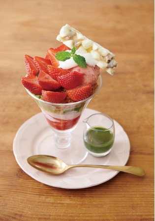 ■商品説明:たっぷりの苺、ストロベリーソース、抹茶ゼリー、さくらホイップ、2種のアイスなどを重ねたスペシャルパフェ。ほろ苦い抹茶ミルクソースをかけてお召し上がりください。