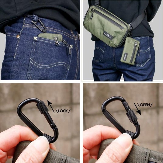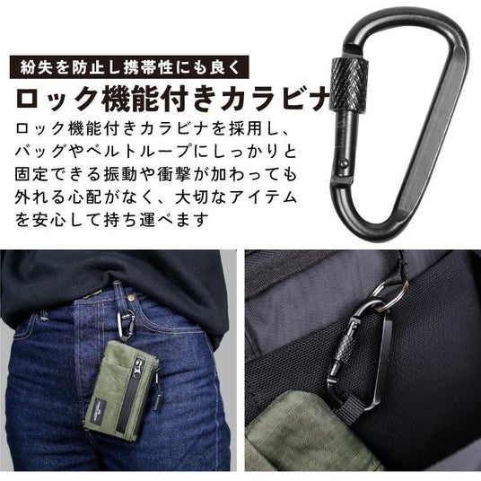 ロック機能付きカラビナでバッグやベルトループにしっかり固定でき、