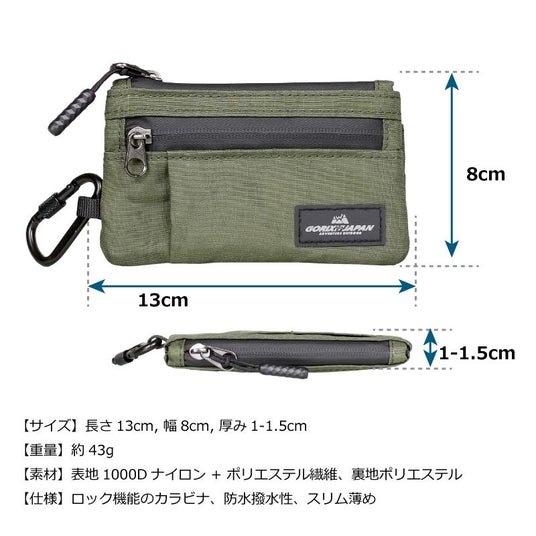 ロック機能付きカラビナを採用し、バッグやベルトループにしっかりと固定できるミニポーチです。