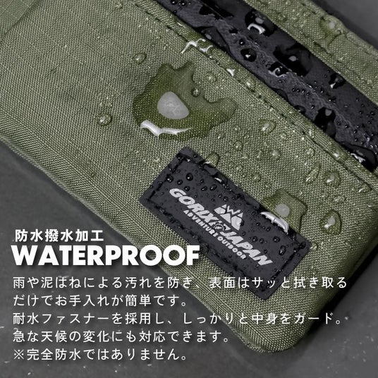 防水撥水加工の表地と耐水ファスナーで、小雨程度なら中身をしっかり保護します。